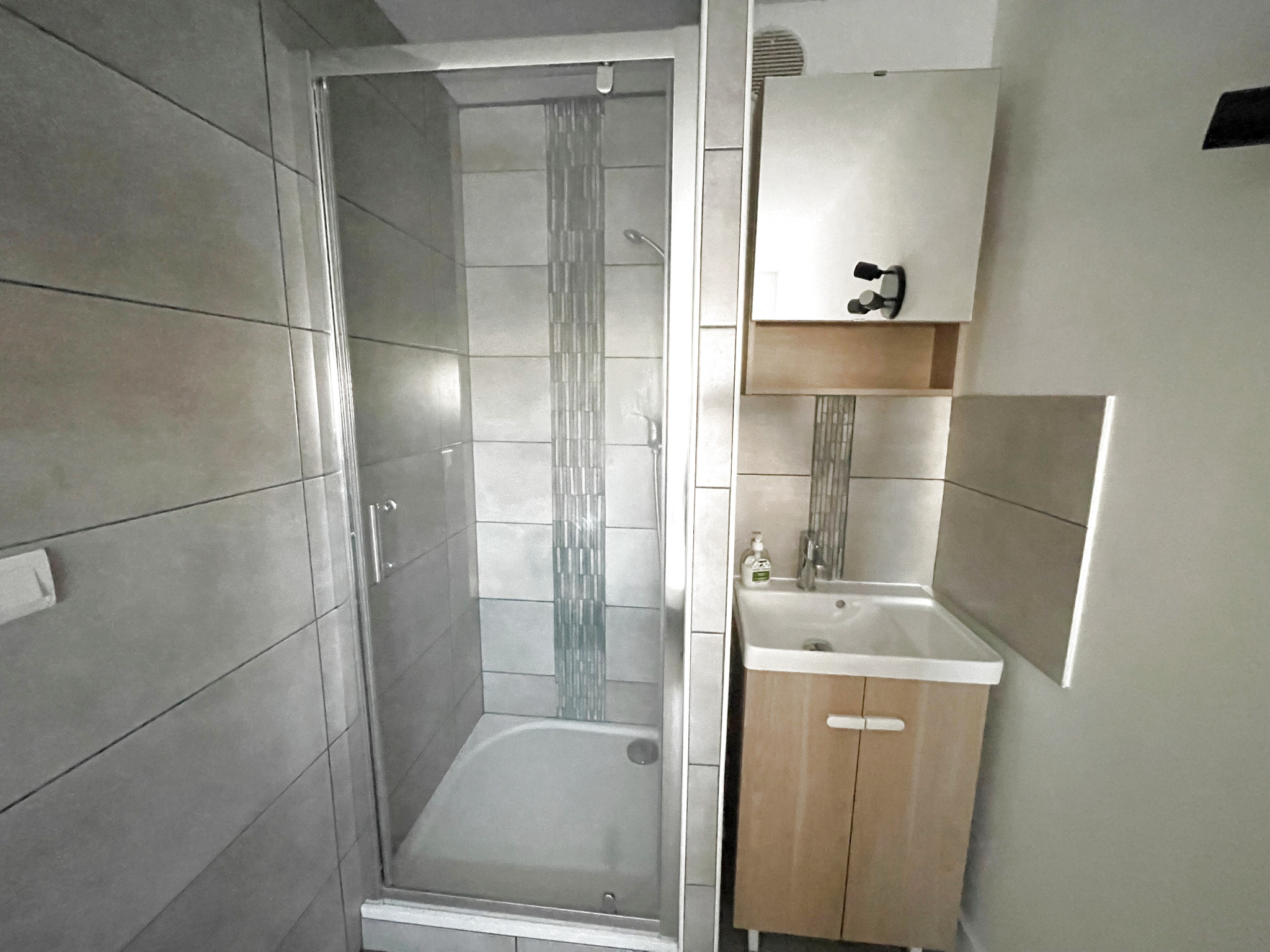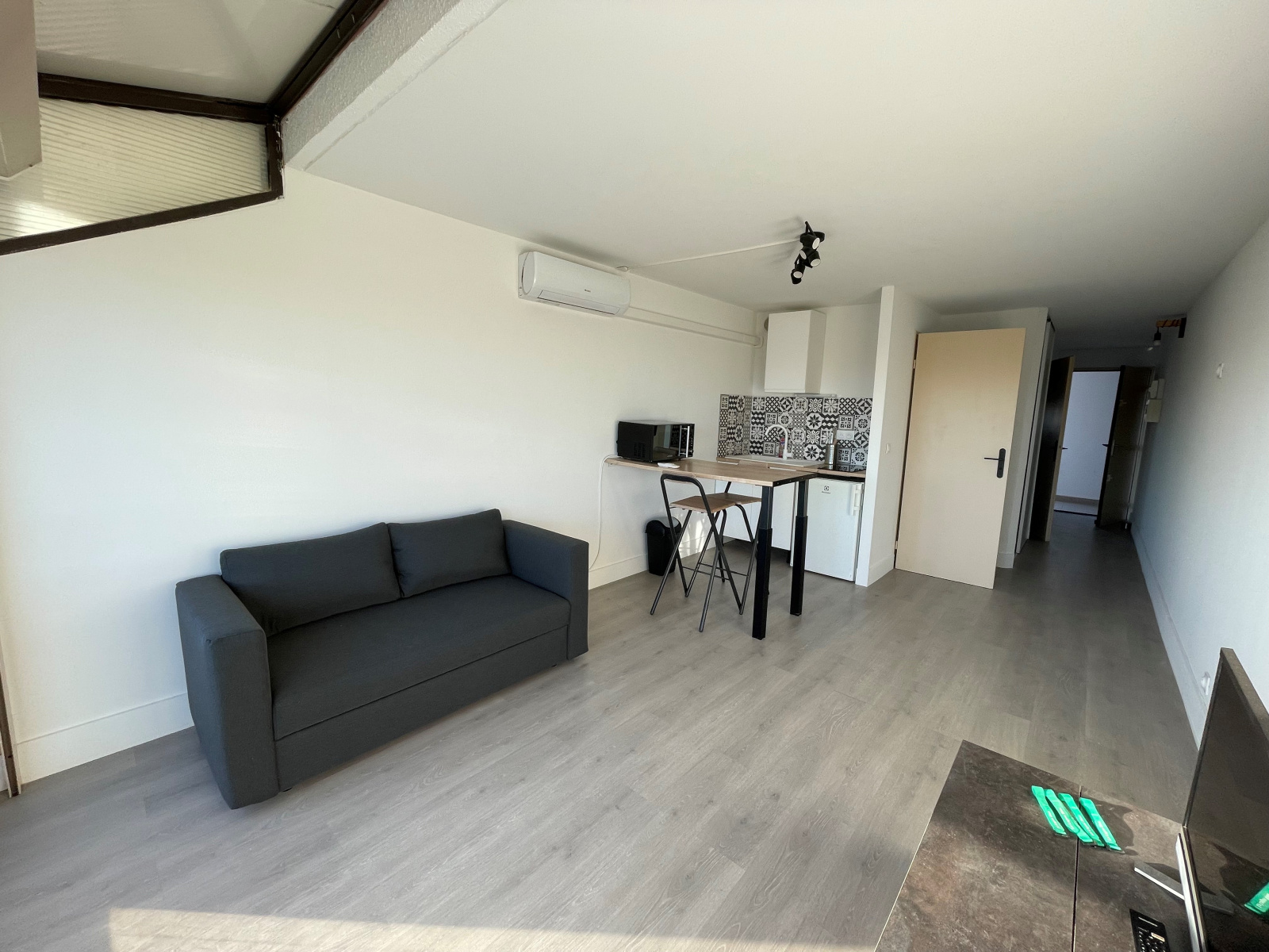 Coin cuisine sur la pièce principale equipée de la climatisation réversible, salle d'eau, WC séparé.