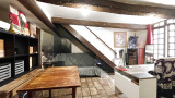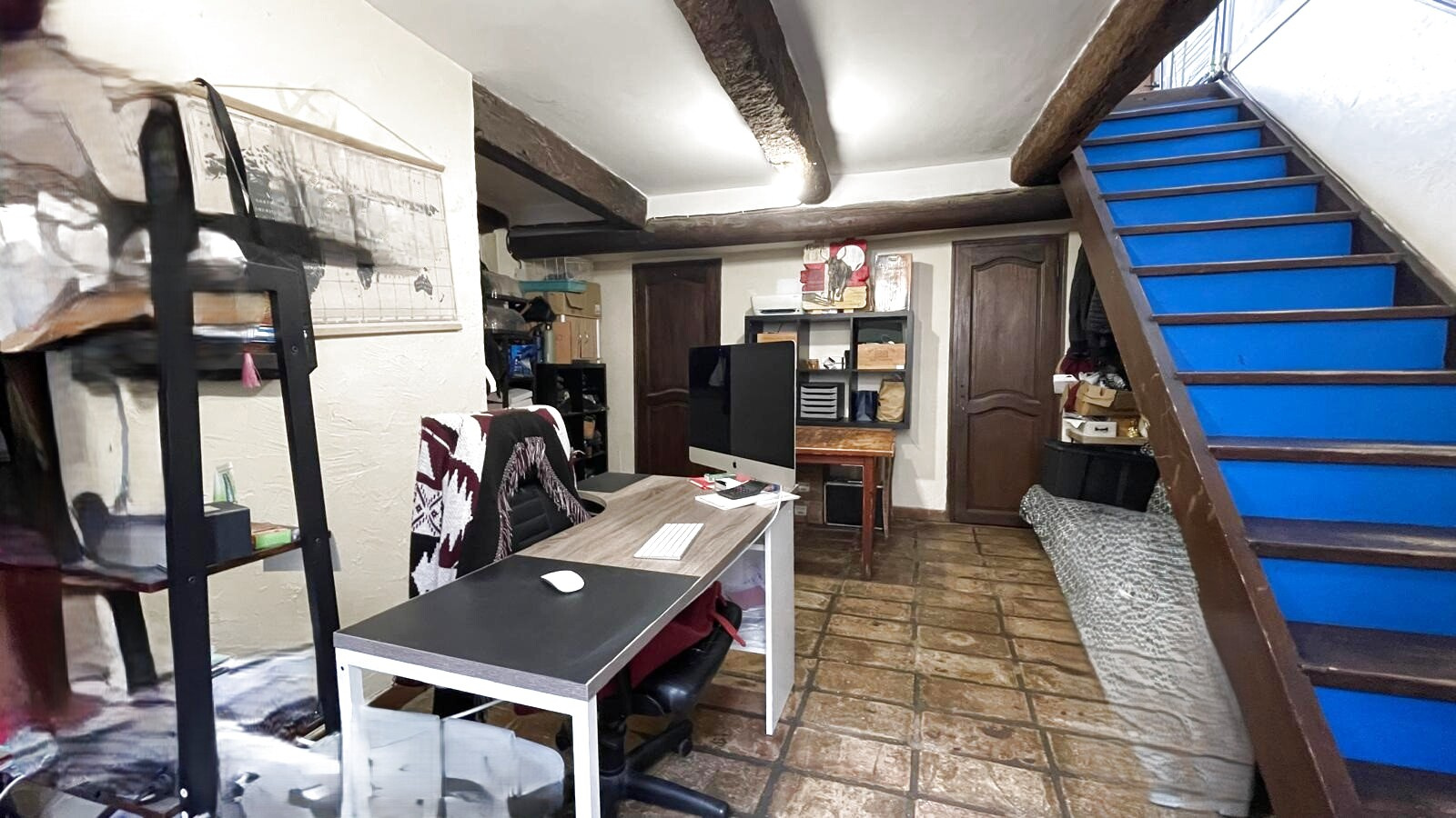 L'appartement se compose d'un bureau, d'une chambre, une salle d'eau avec WC, un escalier desservant l'étage supérieur où se trouve une cuisine ouverte sur le salon/séjour donnant sur une terrasse orientée sud.