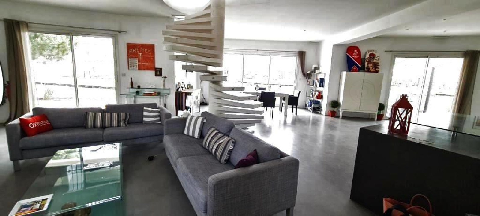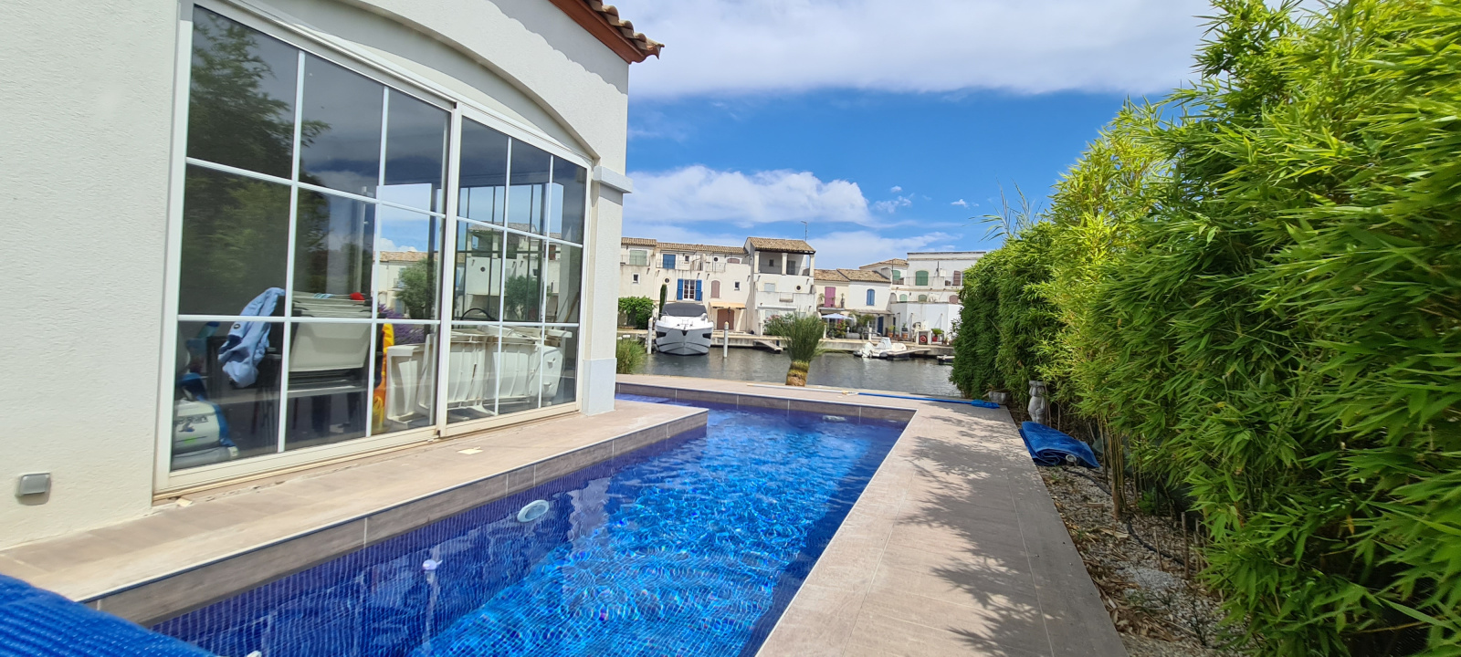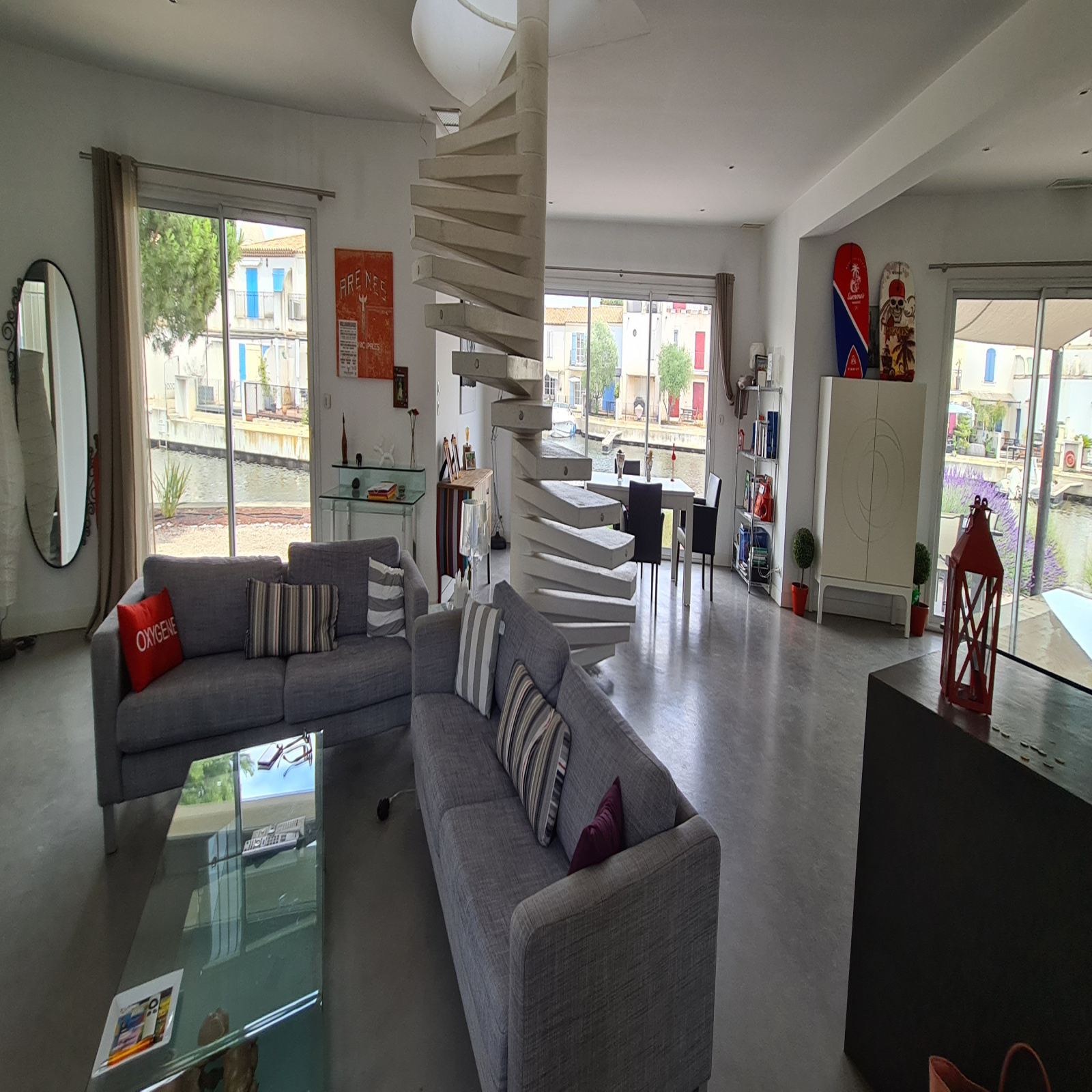 Elle se compose au rez-de-chausée d'une exceptionnelle pièce à vivre d'une surface d'environ 100m² avec cuisine équipée le tout ouvert par différentes baies donnant sur les terrasses, sur le port et son couloir de nage.