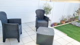 Elle se compose d'une entrée avec wc , d'une cuisine équipée sur la pièce principale avec la porte fenetre donnant accès à la terrasse et jardinet.